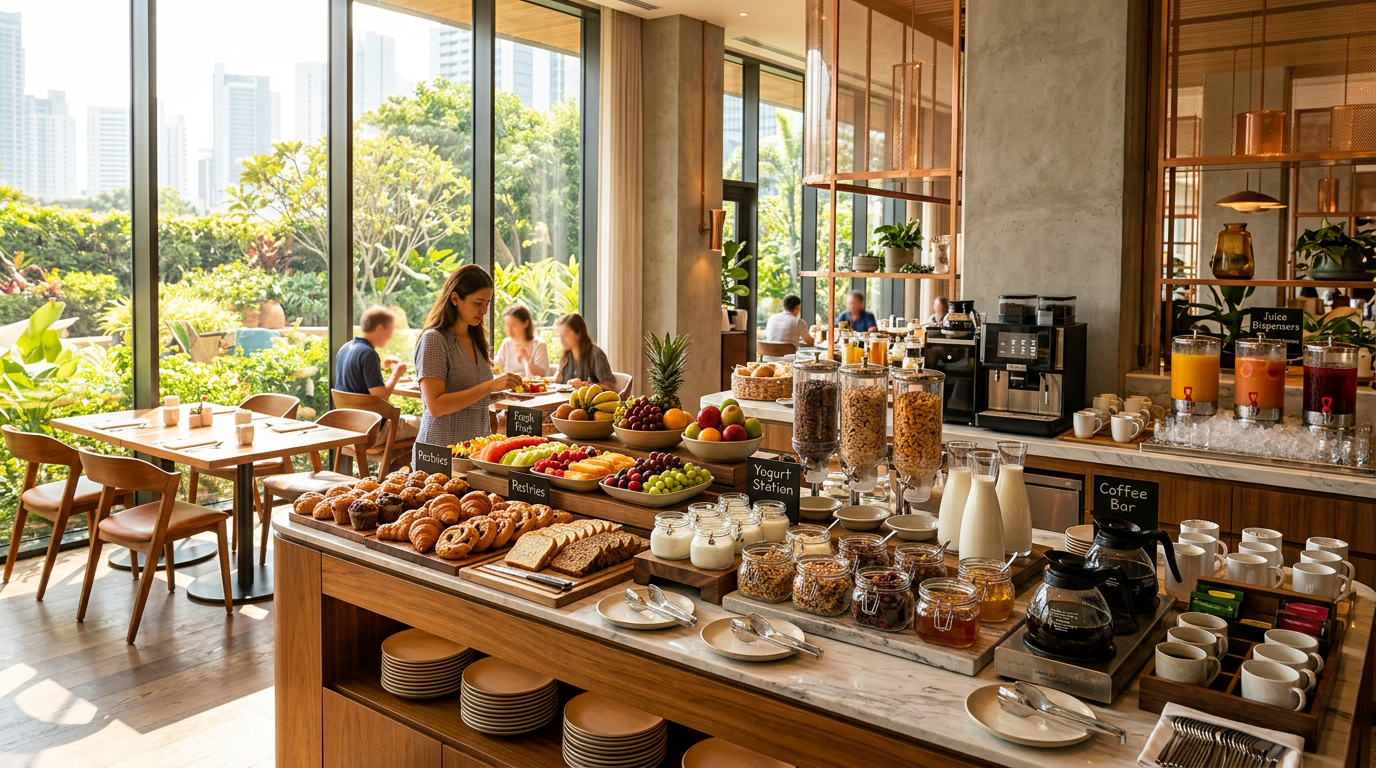 Buffet layouts, continental station design, and equipment solutions for modern hotel breakfast programs.